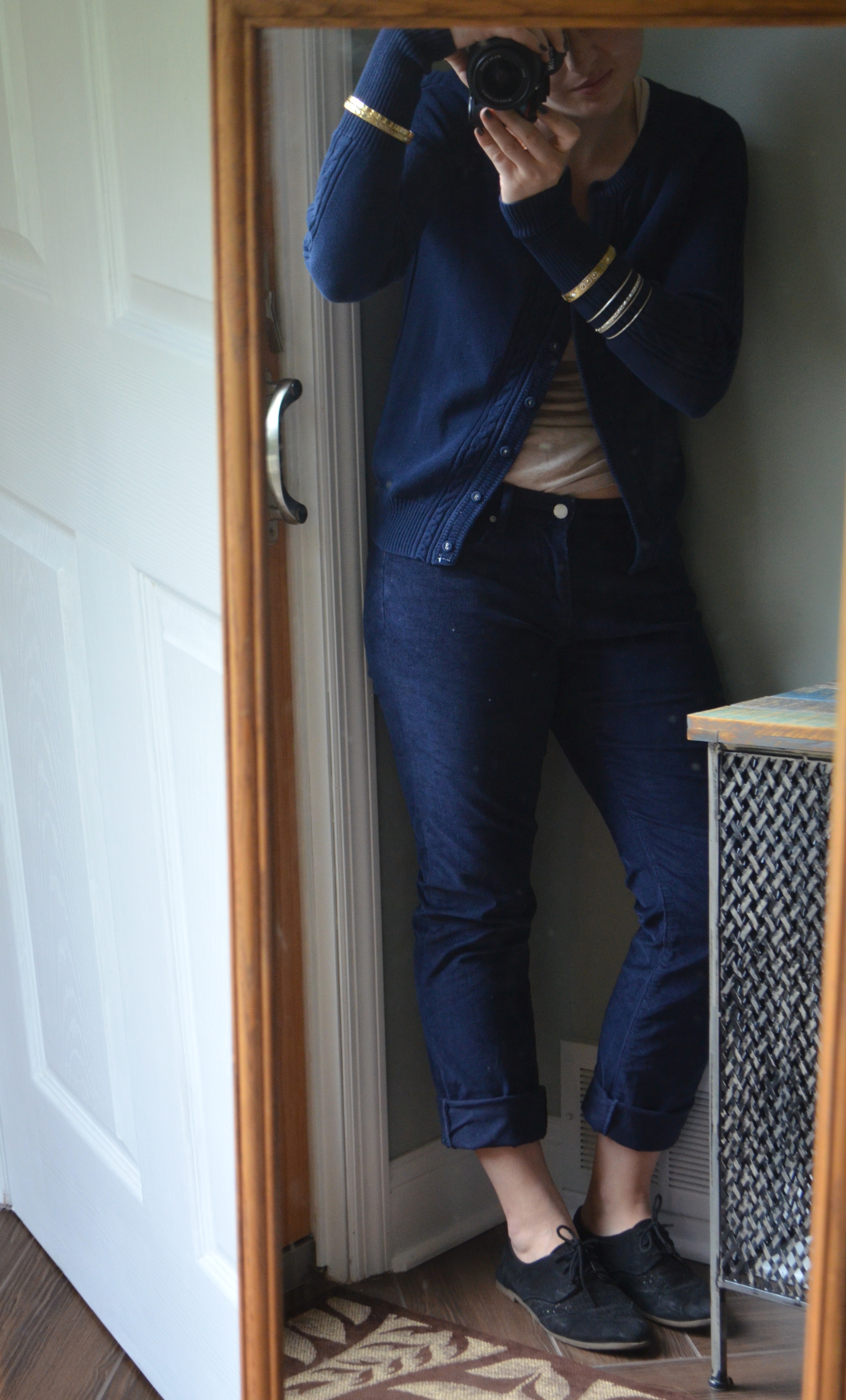 I chose to not button the sweater all the way as well as to cuff the pants simply to break up some of the monochrome of/add a more feminine, stylish touch to the outfit. Also, with it being summertime and all, it was sorta, kinda sweat-prevention.