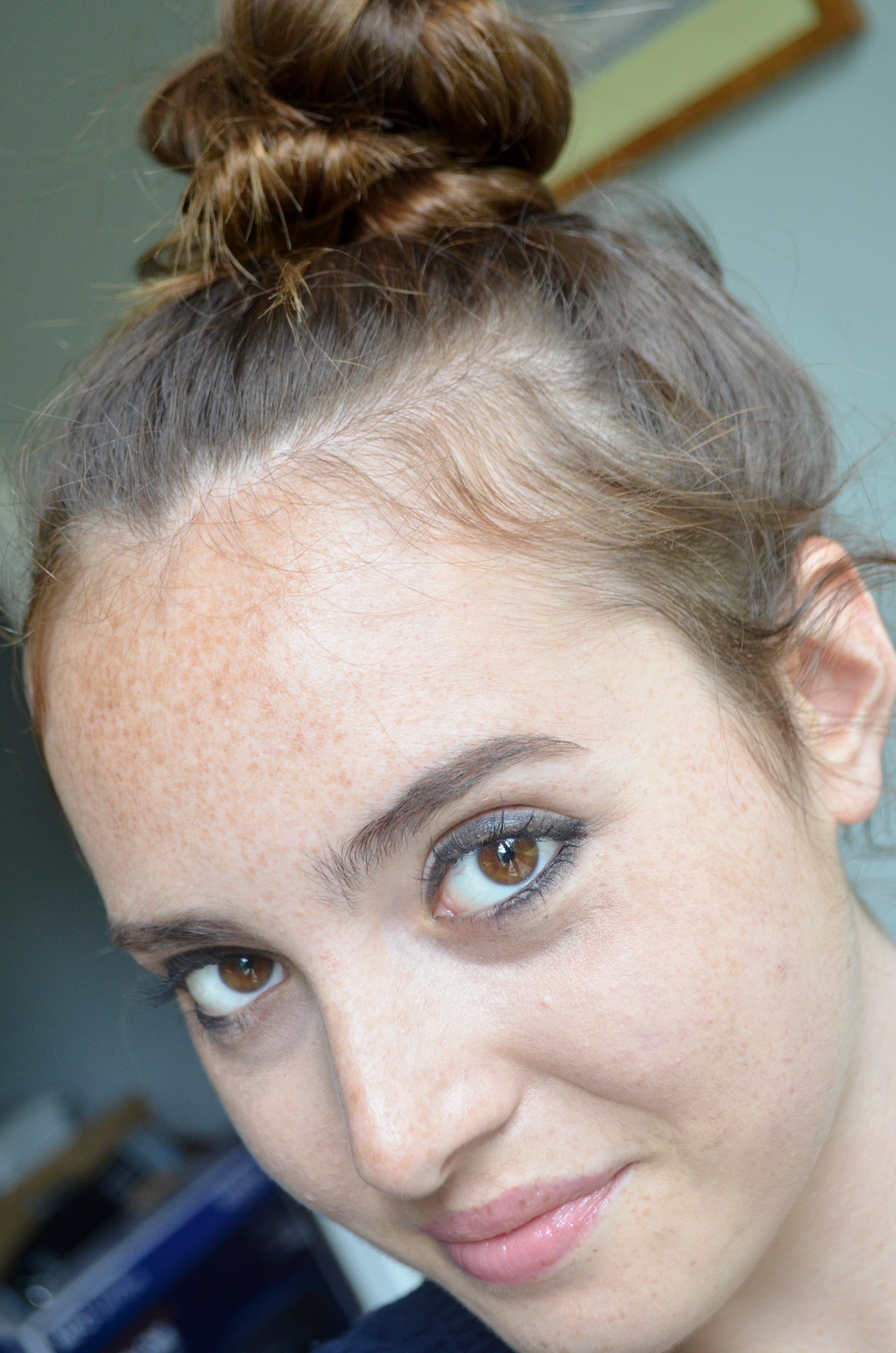 Tip: For an easy topknot, first pull your hair into a ponytail (with a hair tie, of course) at the spot on your head you would like your bun to be at. Then, simply take the ponytail, twist it around the hair tie into a bun, and secure with another hair tie/bobby pins. It’s easy, fast, stays in place all day, and works with virtually any hair length (unless around the chin or shorter/the waist or longer, as I’ve learned from experience).