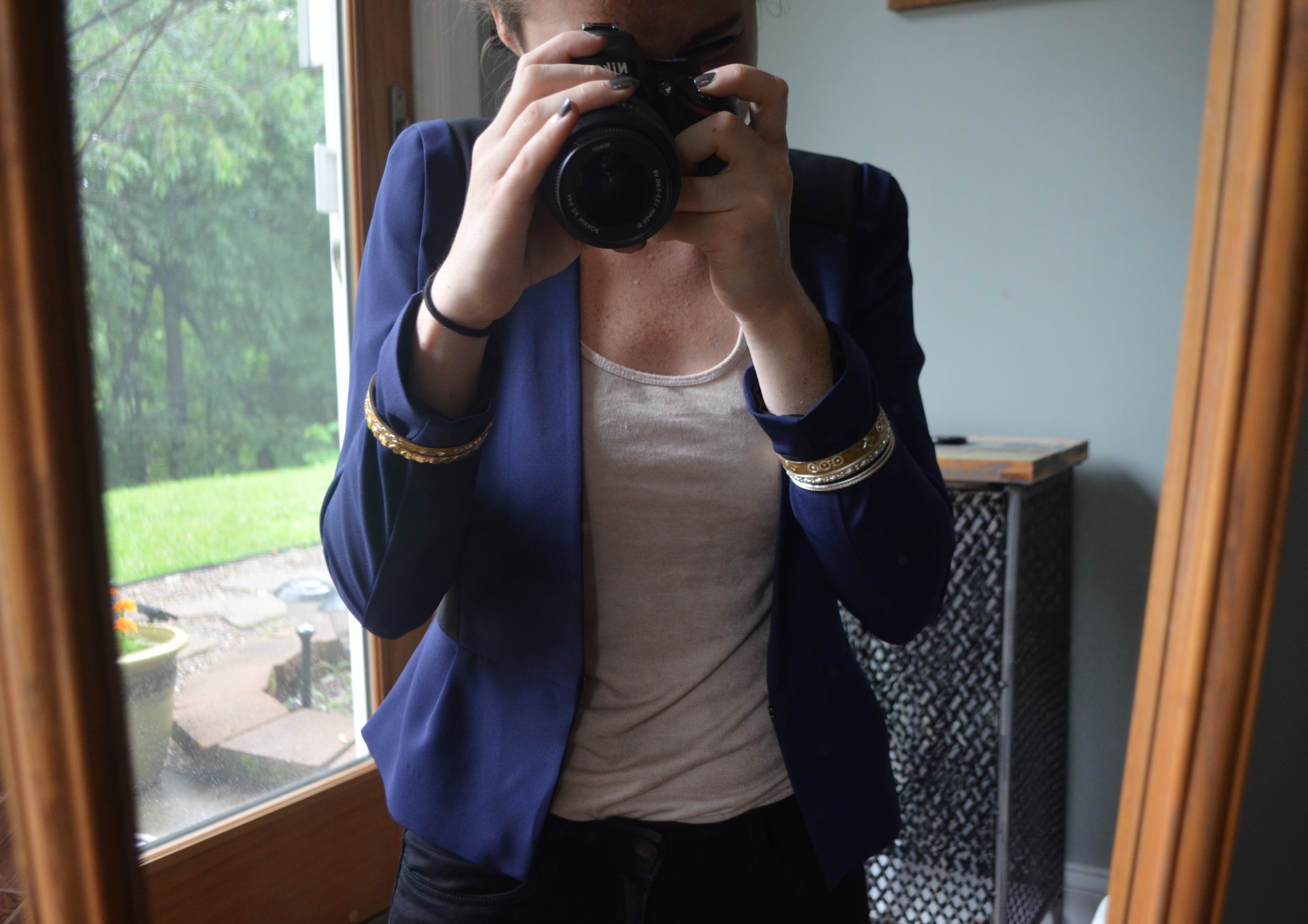 I didn’t, however, change the undershirt, accessories, or shoes. I feel like, whether you go for the blazer or sweater look, keeping those three things relatively gold and black will always pull the outfit together.