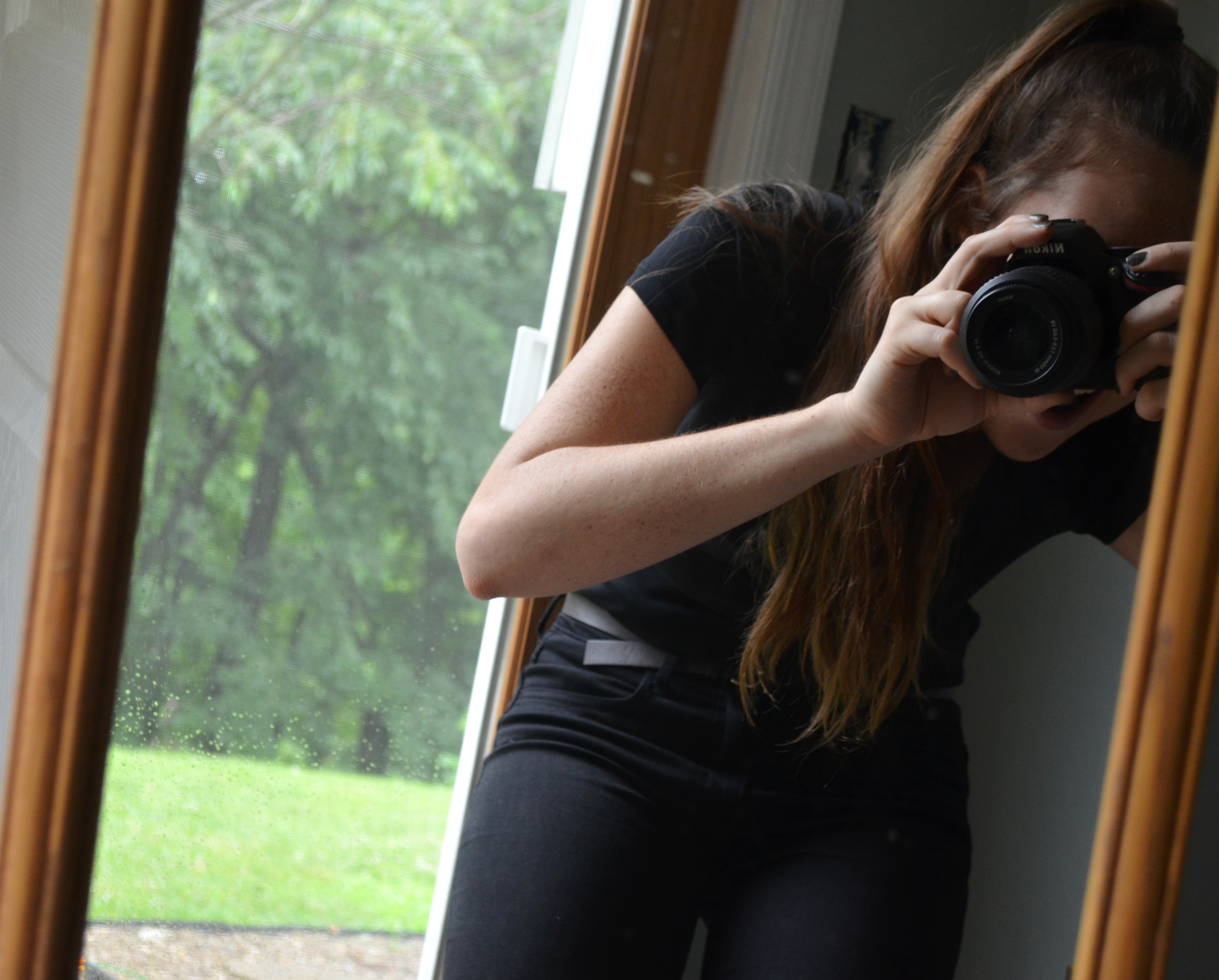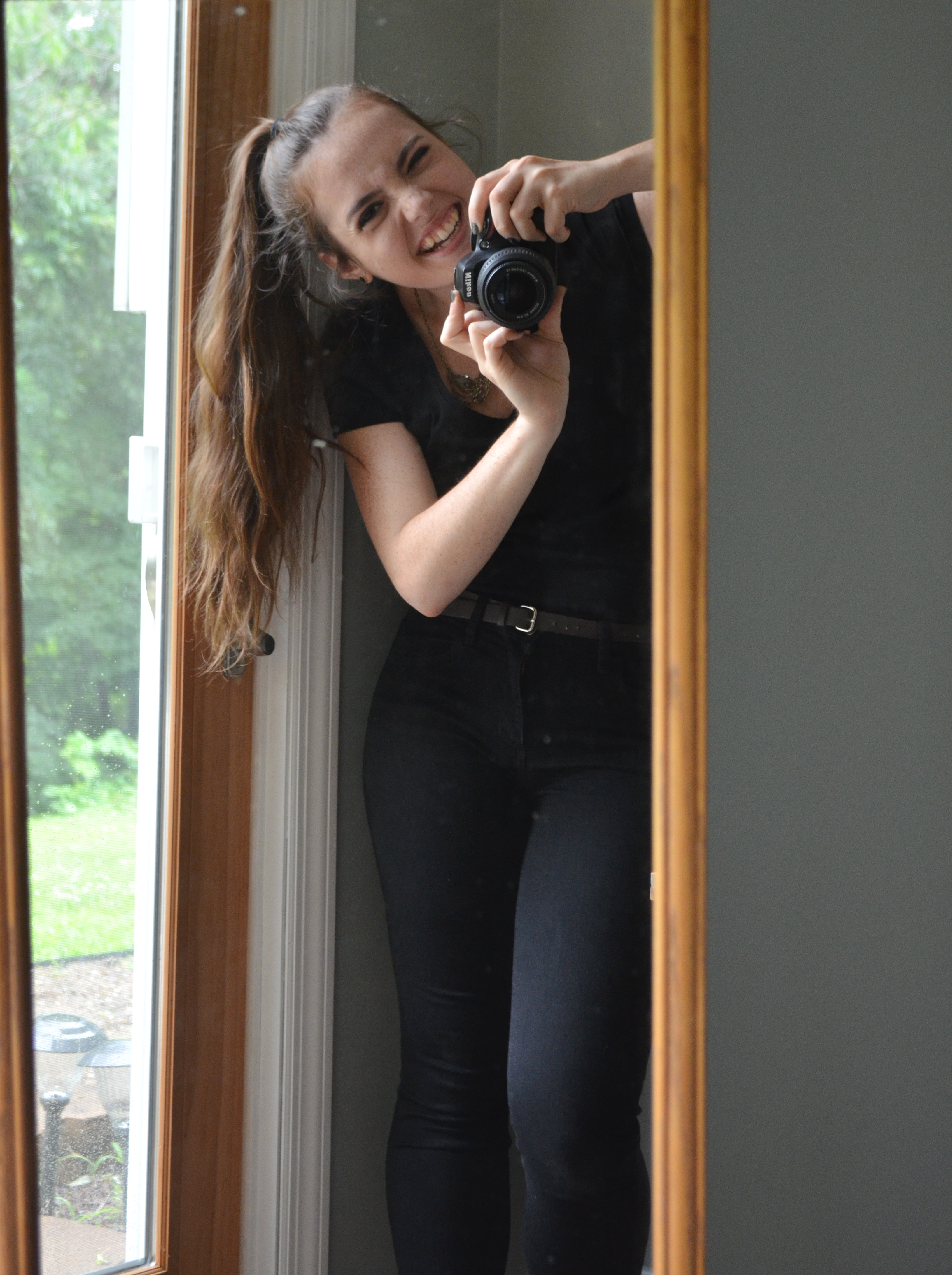 ^I just thought this picture was fun 🙂 It also kind of shows off my hair, which is just a high, side ponytail. I feel like its quirkiness pretty nicely offsets the rest of this rather subdued outfit.