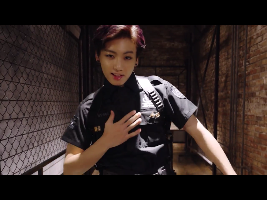 How to Impersonate Jeon Jungkook as He is Impersonating a Police Officer [Without Getting Arrested]: Wear fitted clothing in all black with similarly colored yet kind of sparkly accessories in order to mimic the uniform with all of its bells and whistles. Then add swag.