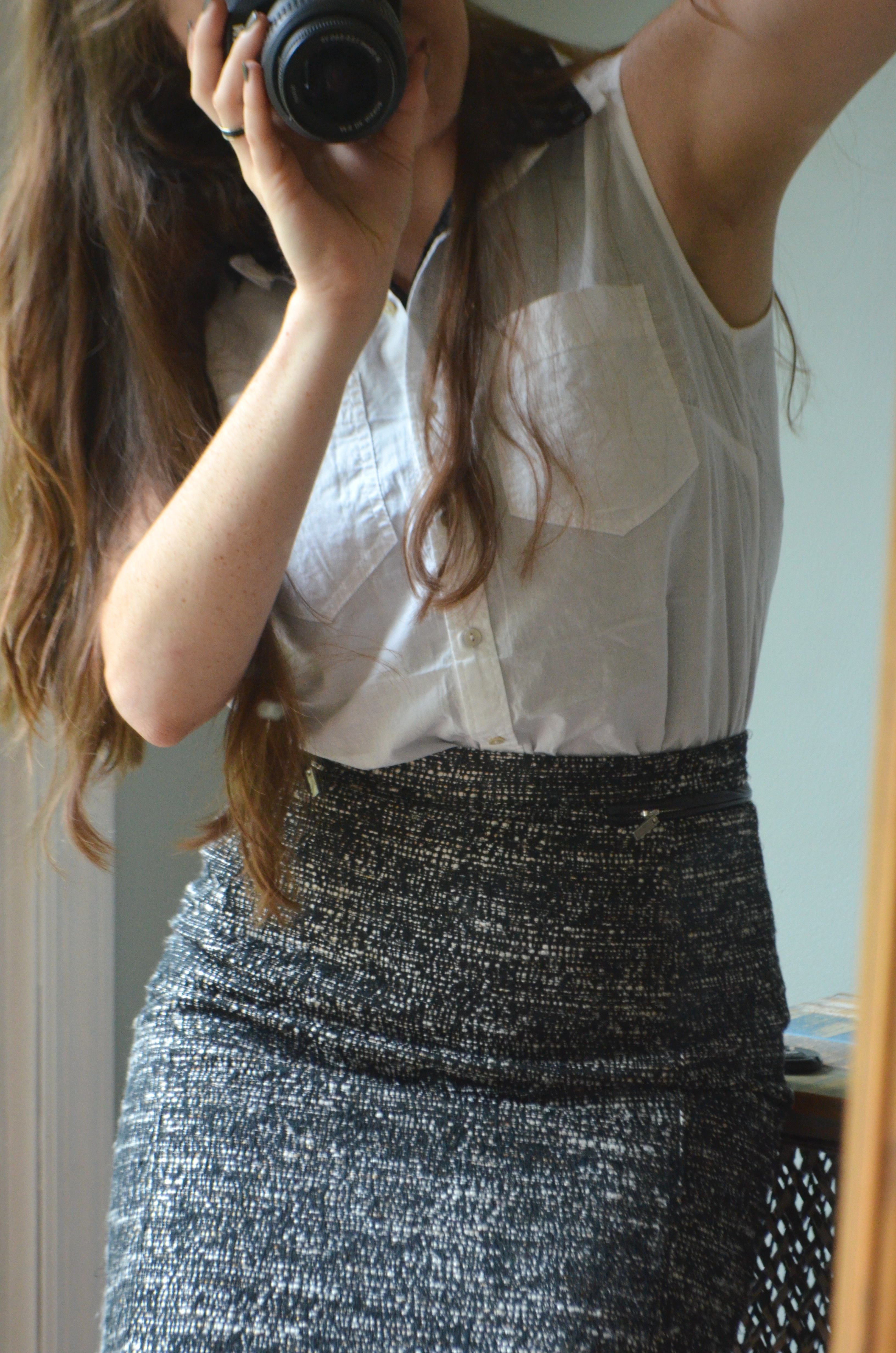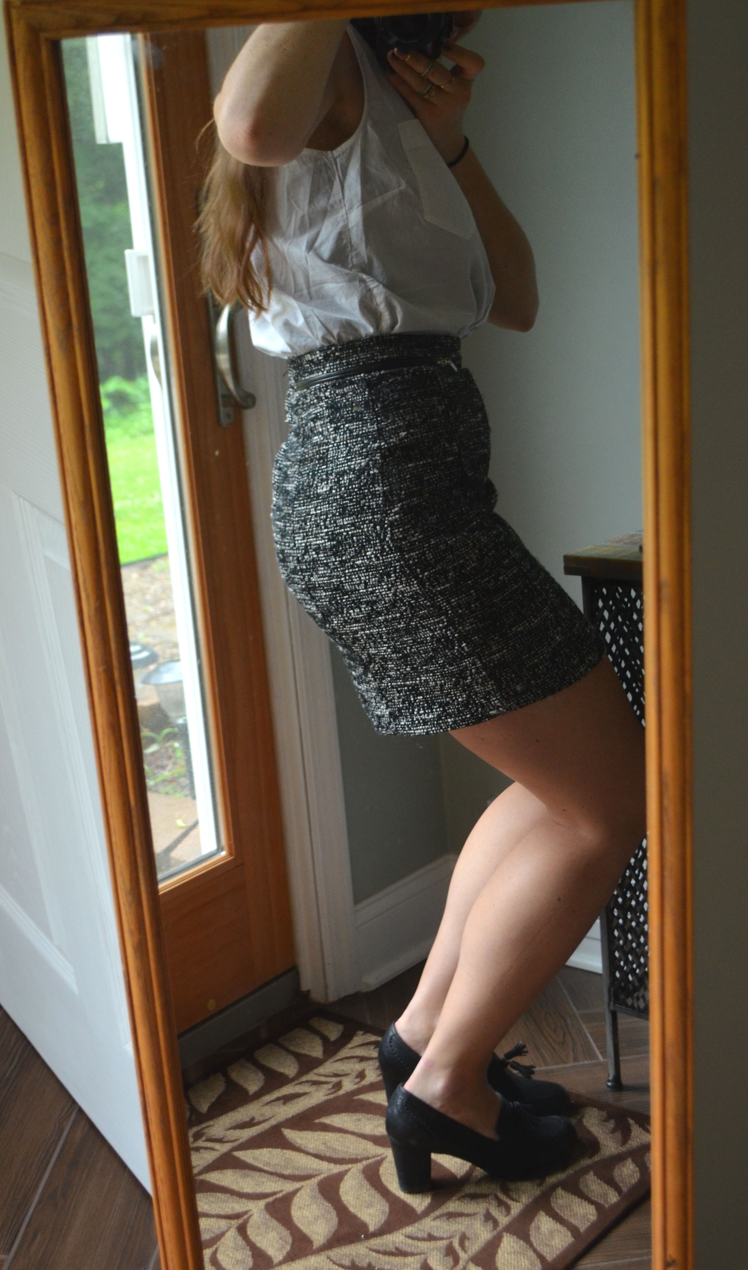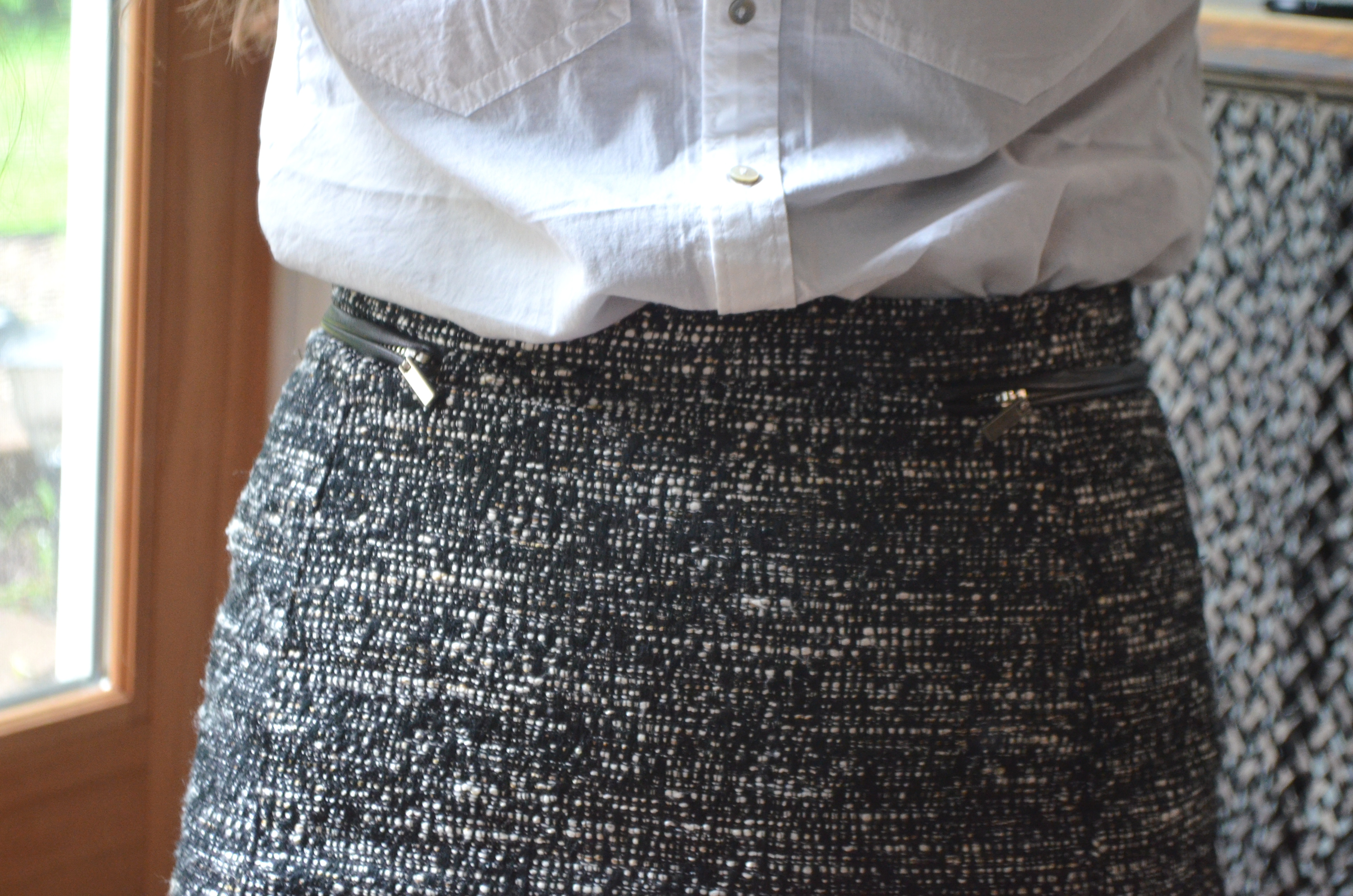 Now, don’t be afraid to choose a kind of busy skirt, like this one, for your bottom half. Even though black-and-white tweed with zippers on the [fake 😦 ] pockets, it will still work with any layered tops, no matter what patterns you have lurking up there. Just keep everything in the same color family, and it will all look great.