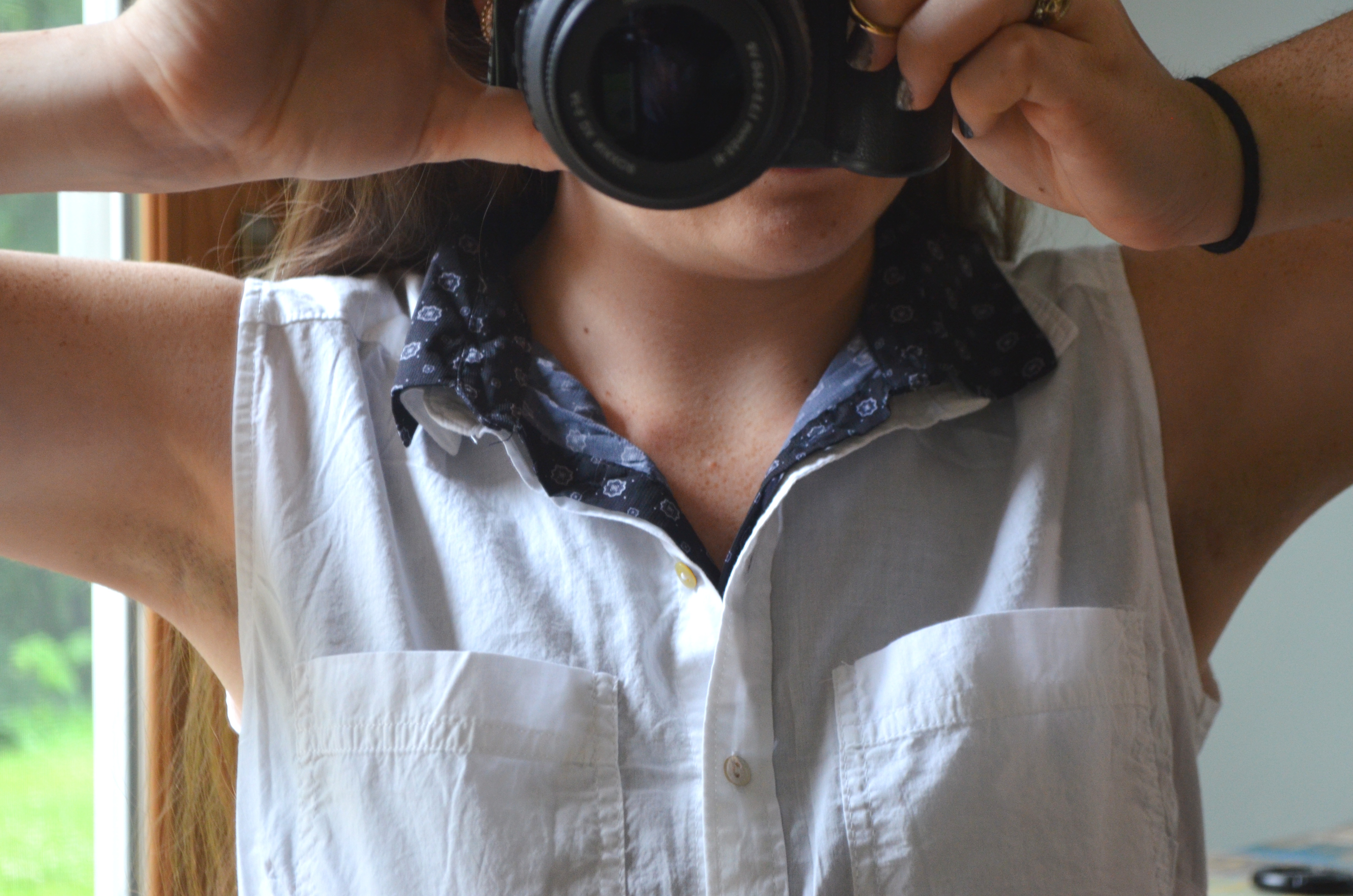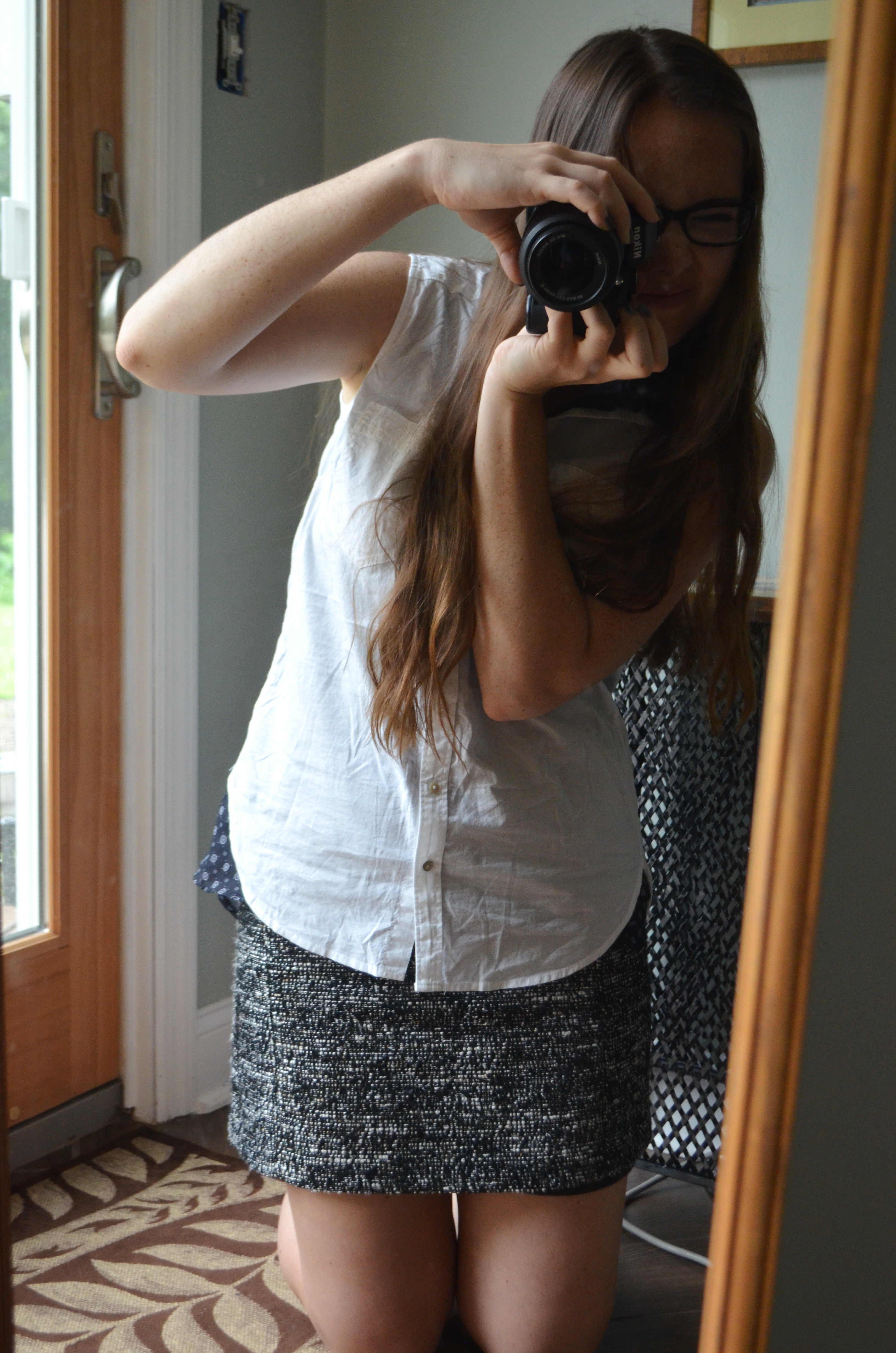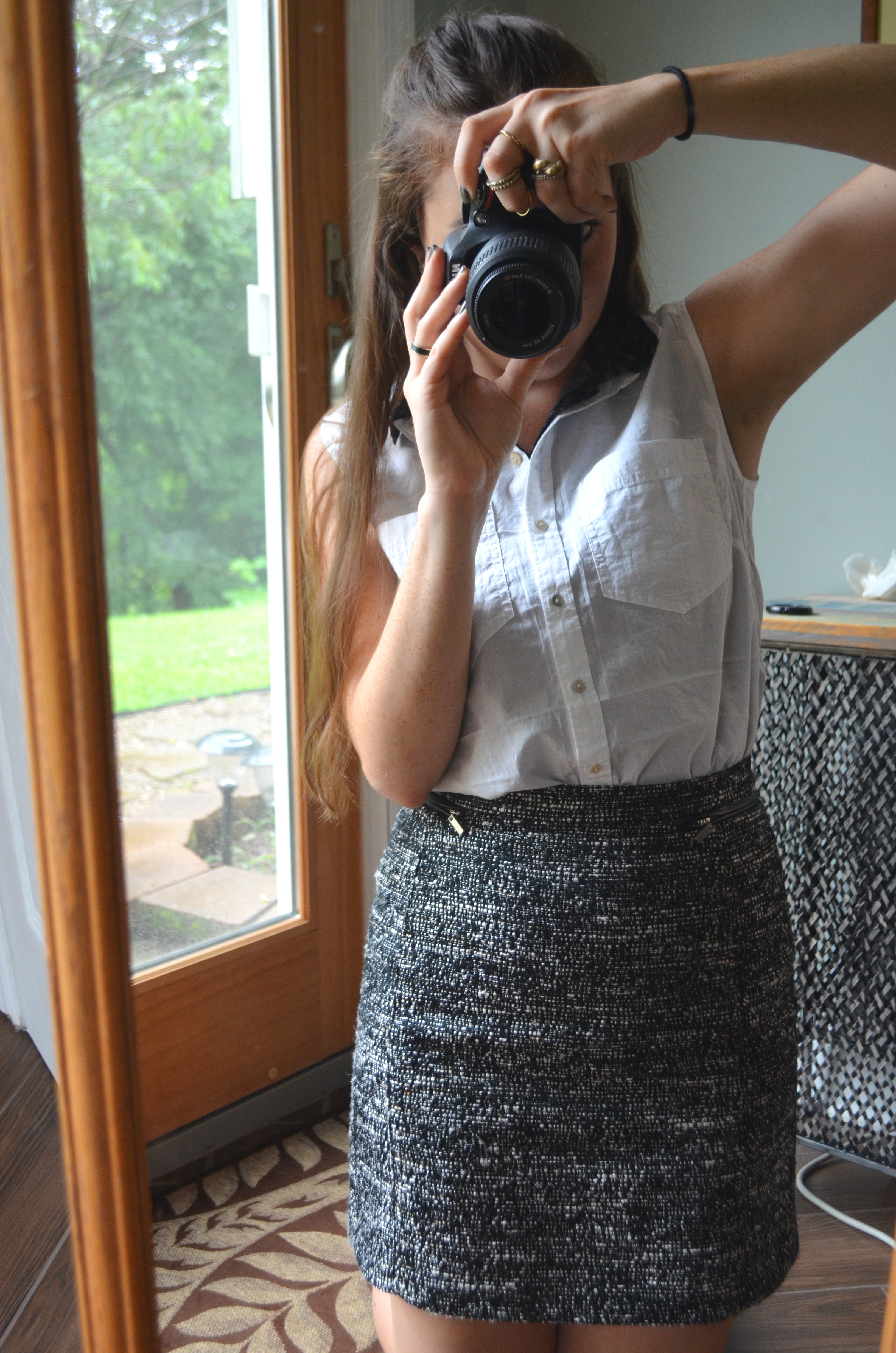 I chose to layer a black patterned shirt underneath the white one in order to replicate the neck ties that the boys wear. You can certainly add a tie to the look if you want, though; it would still look totally cool, especially if you tucked the bottom of it into your skirt. I just don’t have any ties, though, so I opted for this.