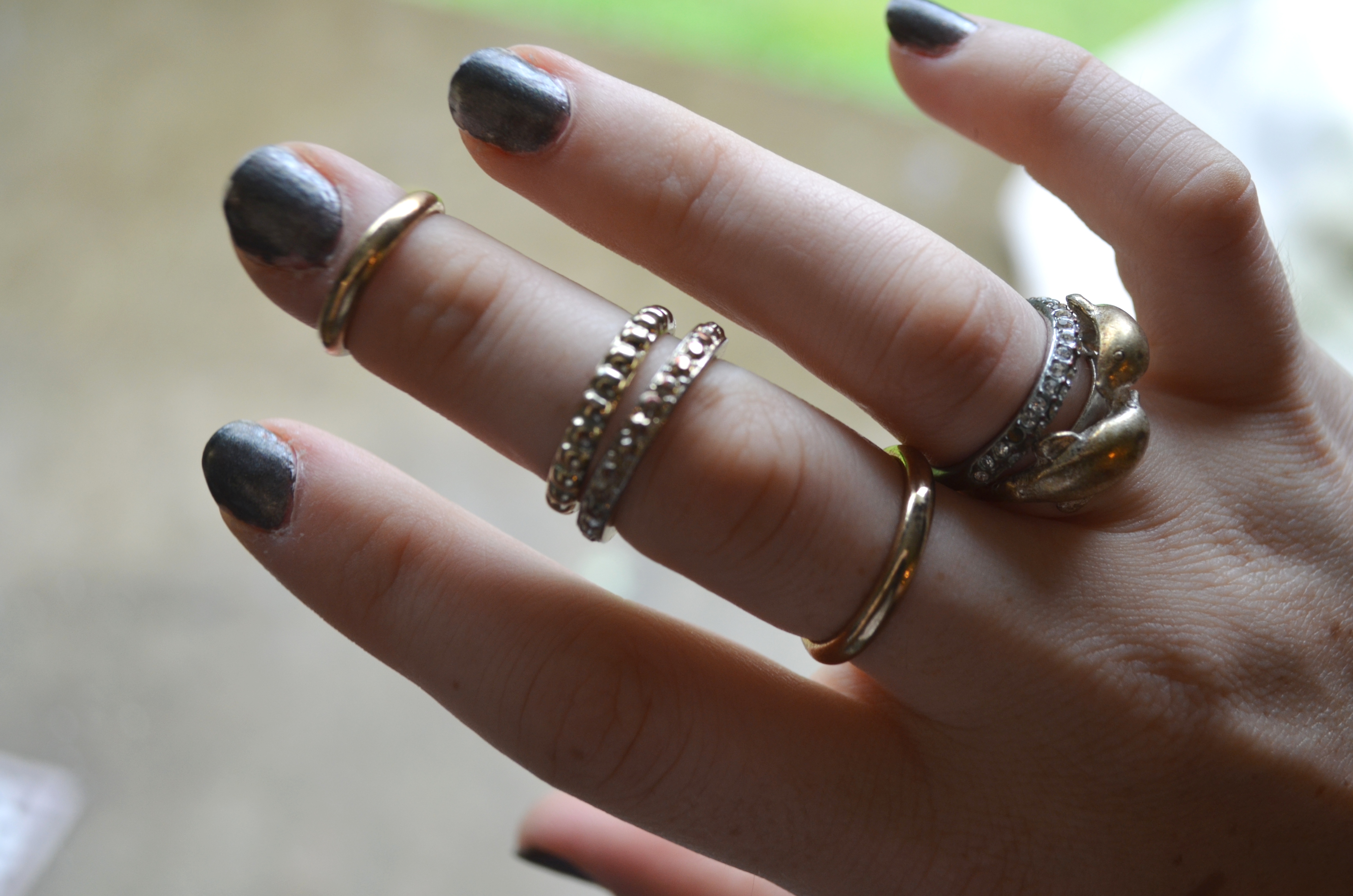 Now, it’s a classy sort of pimping, but it’s still pretty flashy. The easiest way to recreate it is to stack on your right hand a bunch of pretty rings varying in band thickness.