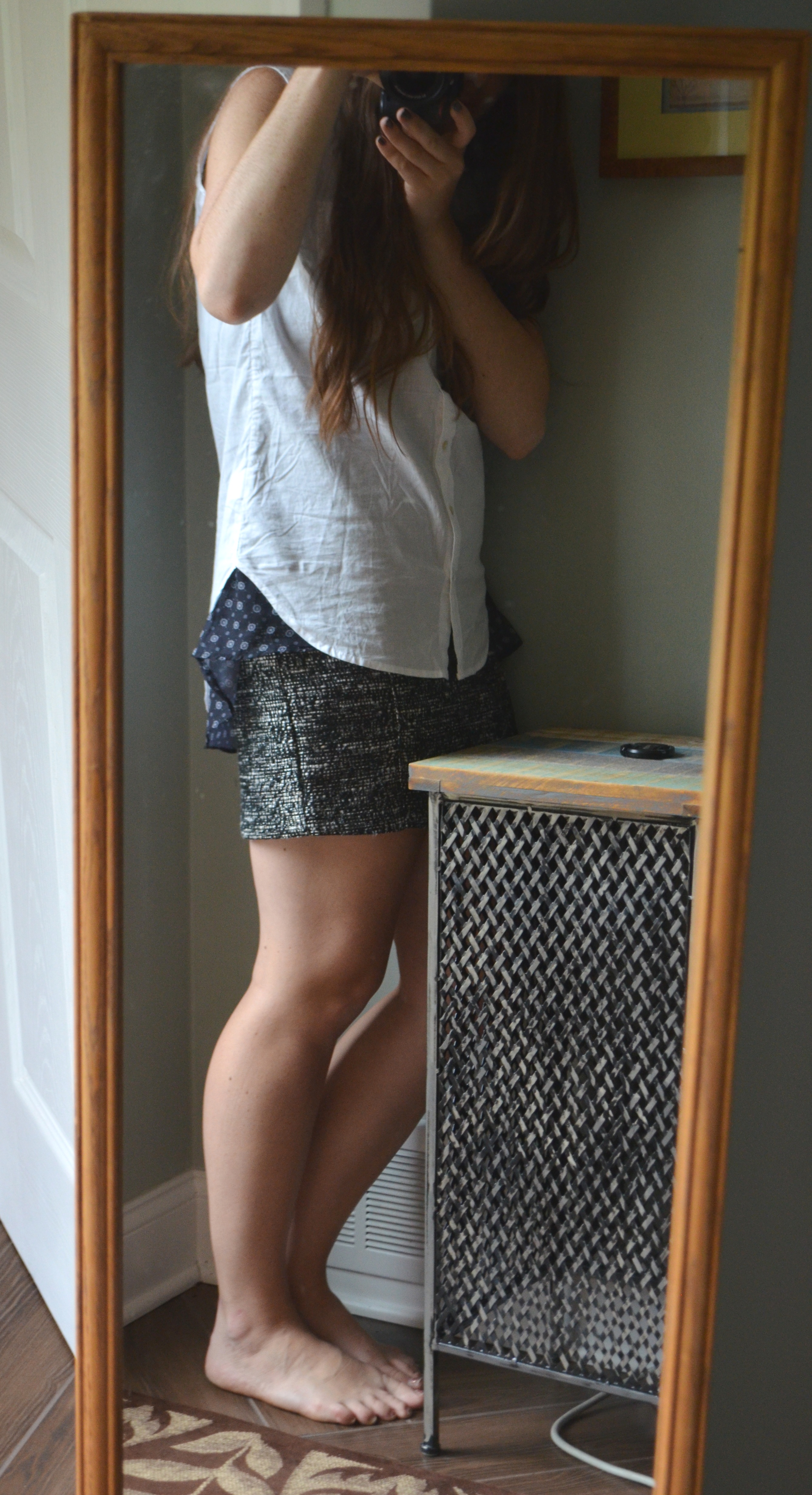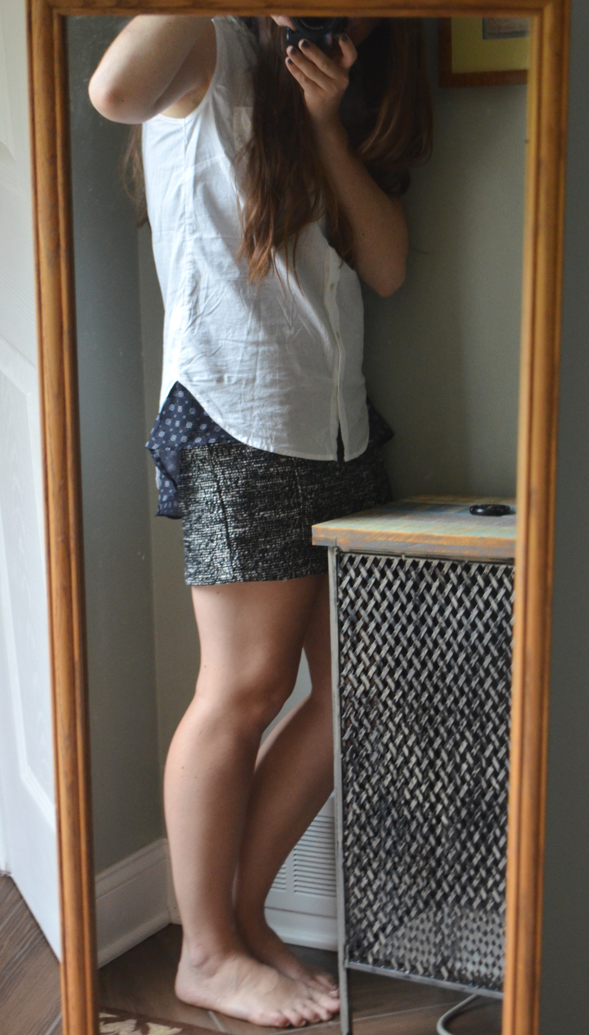 I actually prefer this look to the other, prim-and-proper one. However, I do recommend actually wearing shoes if you’re going to try it. To me, flats of some sort would be ideal.