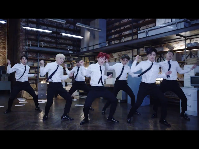 Tuck your shirts into the skirt for the streamlined, pulled-together feel that the boys have in this scene of the MV.