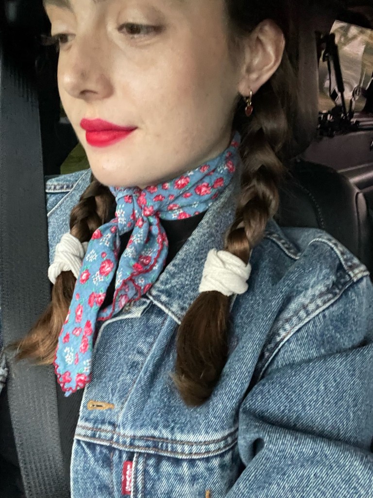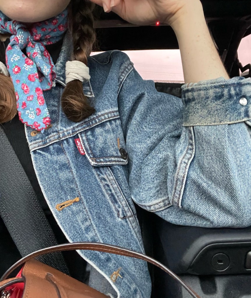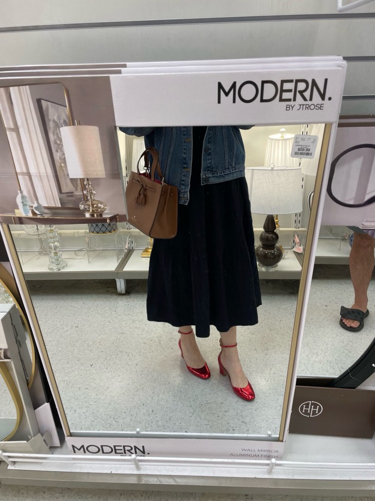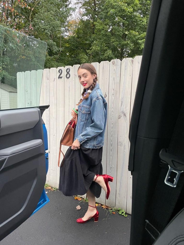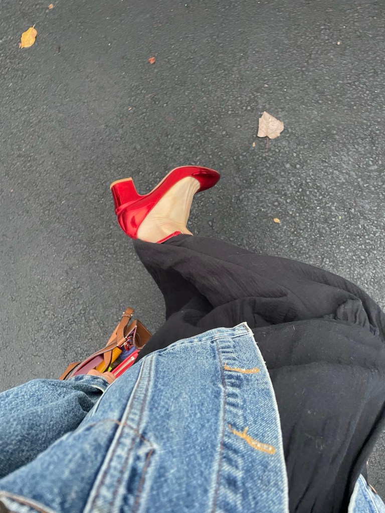 I loved this outfit because it was slightly out of my comfort zone while also being completely me. The pops of vibrant, scarlet red against the muted, gray-toned denim felt so classic and elegant yet simultaneously so fresh and fun (thanks to the rugged vs dressy contrast), and the metallic finish on the red Mary Jane’s only added to that. I’ve had these shoes for several years now—a birthday gift from my sister sometime around 2020—and while Mary Jane’s weren’t that popular back then, I’ve always personally loved them. Now, this style of shoe is all the rage, but it’s not too often you see a bright-red, metallic pair. So, the slightly unique flair to this somewhat overdone, trending classic made it feel a little less copy-cat and even more adorable.